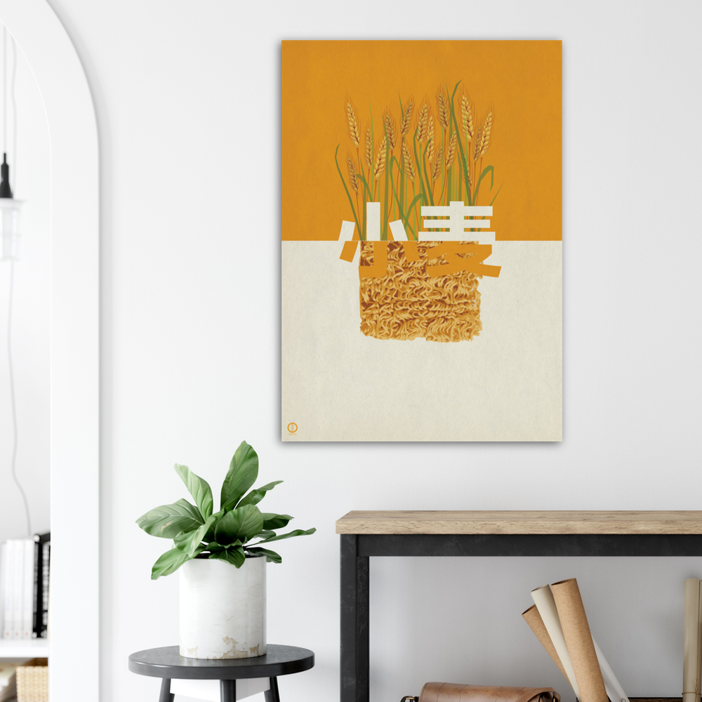 🖼️ The design pairs a stalk of wheat with a bowl of freshly cooked noodles, captured in a clean, minimalist style that suits any space, kitchen, dining room or office.